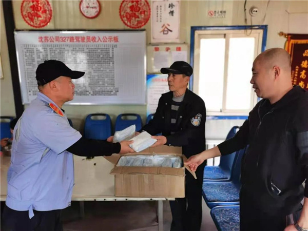 5月1日一早,王大爺帶著一箱口罩來(lái)到了沈蘇公司327車(chē)隊(duì)。