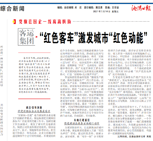 7月14日,沈陽日報以《 “紅色客車”激發(fā)城市“紅色動能”》為題報道了沈陽客運集團以黨建為引領,助推企業(yè)高質(zhì)量發(fā)展之新變化。
