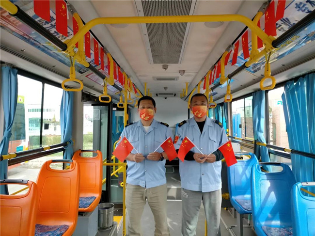國慶節(jié)臨近,152車隊積極打造“歡度國慶”主題車廂。公交車廂里掛滿了五星紅旗和貼紙,還有印著“我愛你,中國”字樣的口罩,為市民乘客營造著喜慶的節(jié)日氣氛。