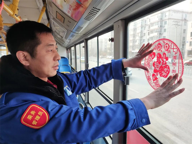 大年三十,堅(jiān)守崗位的駕駛員給公交車窗貼上“福”字,布置節(jié)日飾品,讓節(jié)日期間乘坐公交車出行的市民感受到新春的氣氛。