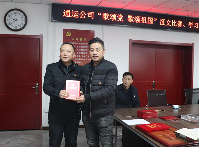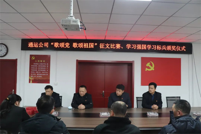 1月12日上午,通運(yùn)公司在一樓會(huì)議室召開(kāi)“歌頌黨 歌頌祖國(guó)”征文比賽、學(xué)習(xí)強(qiáng)國(guó)學(xué)習(xí)標(biāo)兵頒獎(jiǎng)儀式,公司領(lǐng)導(dǎo)班子及各支部書(shū)記、獲獎(jiǎng)職工代表參加,共30余人。