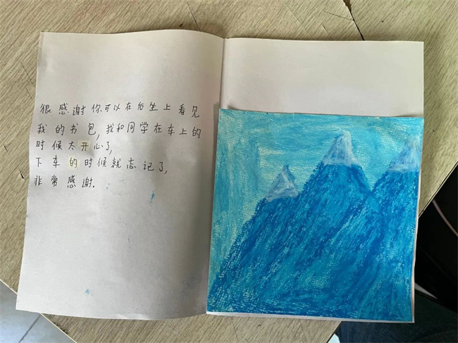 打開這封信,是一封由小朋友自己親手制作的感謝信,信中寫道:“很感謝你在后座上看見我的書包,我和我的同學(xué)在車上的時(shí)候太開心了,下車時(shí)就忘記了,非常感謝?!薄昂芨兄x你幫我找到了我的書包,書包對我來說很重要,謝謝。”