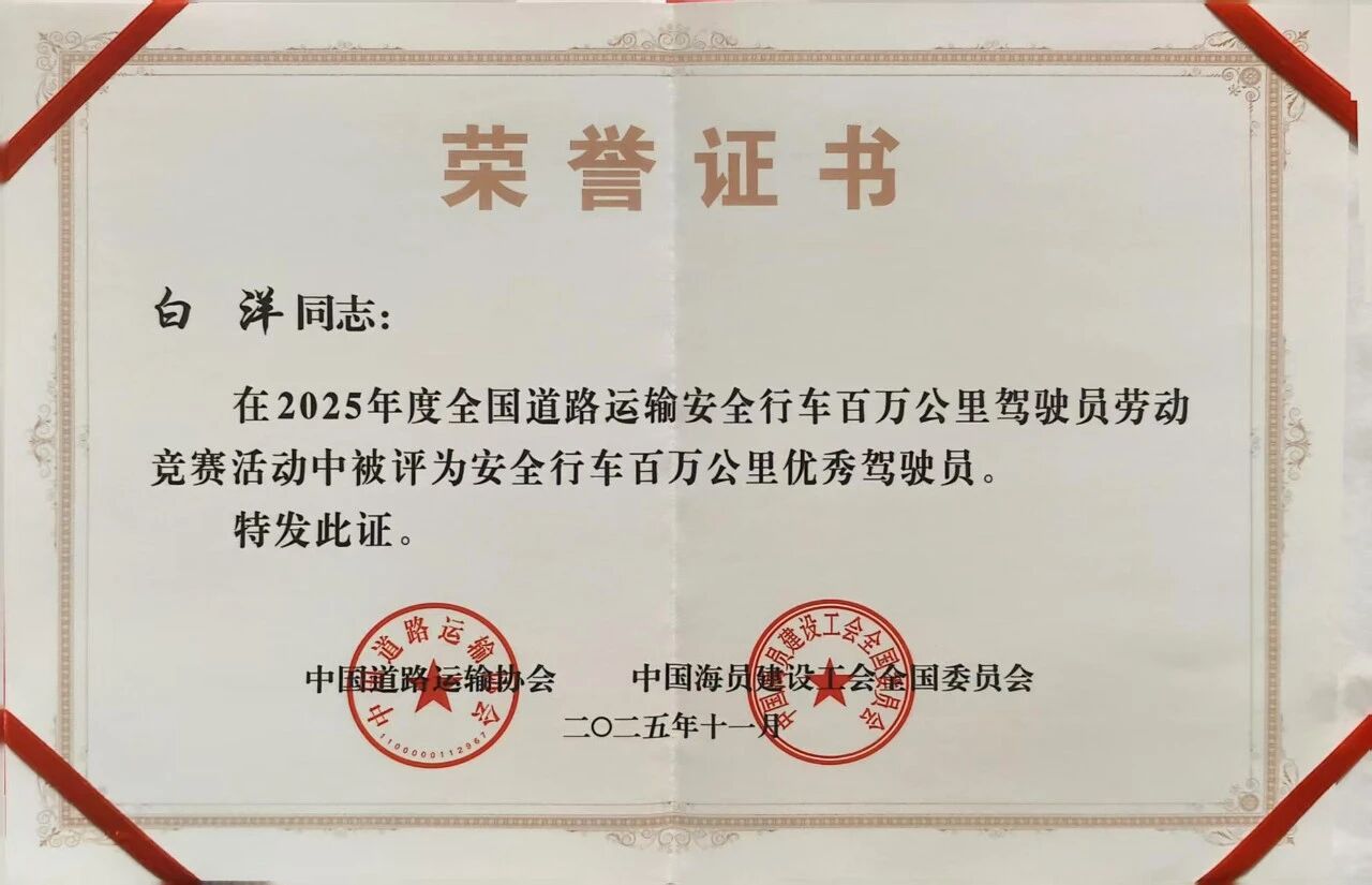 會上,沈陽客運集團黃河公司青城山路車隊190路三星級駕駛員白洋同志獲得的榮譽表彰成為全場矚目的亮點——在2025年度全國道路運輸安全行車百萬公里駕駛員勞動競賽活動中,白洋獲評“安全行車百萬公里優(yōu)秀駕駛員”,交通運輸部科學研究院首席研究員、學術委員會常務副主任李忠奎親自為他頒發(fā)獲獎證書。這份殊榮在遼寧省僅有兩人獲得,為沈陽客運集團贏得了榮光。