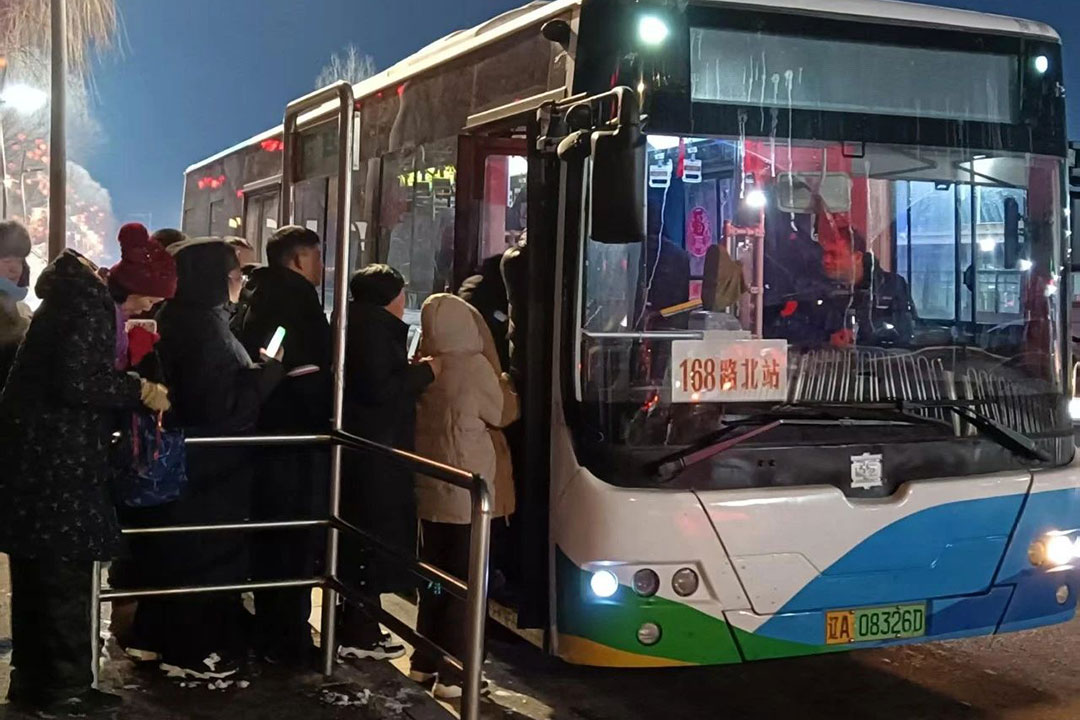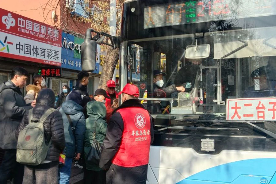 在219路大二臺子公交站臺,一位拄拐老人正在志愿者的攙扶下平穩(wěn)登車;寒風(fēng)中,身穿紅馬甲的工作人員細(xì)心擦拭著候車長椅;車廂里,...