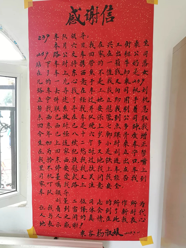 9月11日上午,乘客楊淑媛的女兒把感謝信親自送到康利公司239路車隊(duì)站務(wù)室,感謝駕駛員劉立寧、董愛武對(duì)自己母親的暖心幫助。
