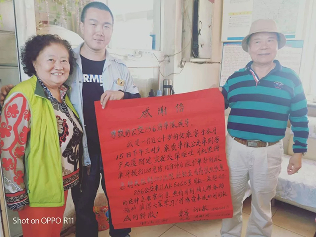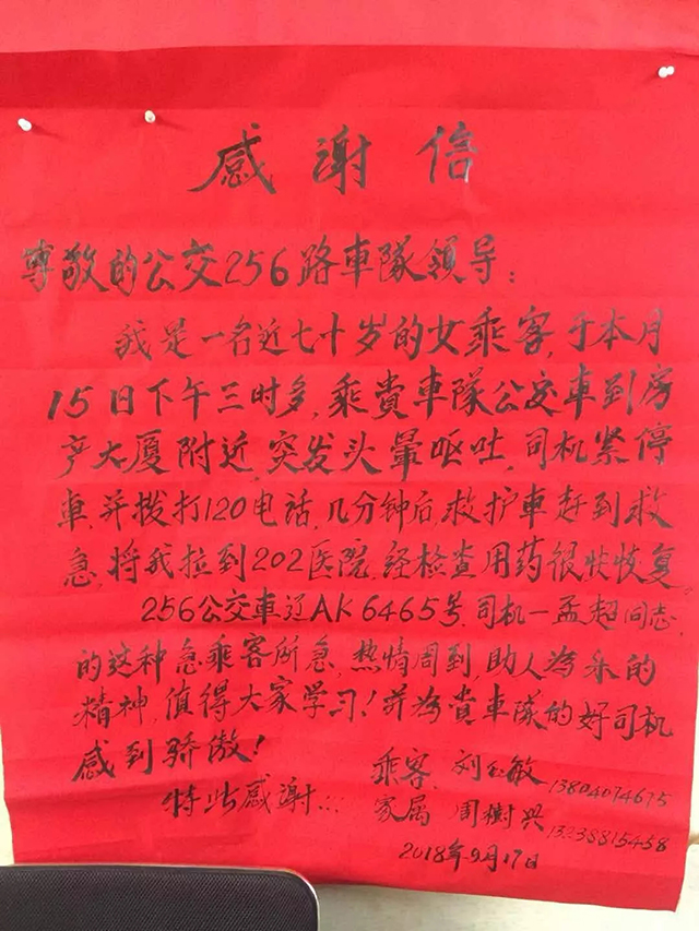 兩天后,老人攜同老伴,將一封寫滿真情的感謝信送到了通利公司256車隊(duì)。老人說:“當(dāng)天舊疾復(fù)發(fā),非常危急,萬幸救護(hù)及時才沒有釀成悲劇?!睋?jù)悉,在經(jīng)過短暫治療后,老人不顧阻攔,堅(jiān)持要親自來到公交車隊(duì)對孟超同志表達(dá)感謝,并請求車隊(duì)領(lǐng)導(dǎo)對孟超這種救死扶傷的高尚品德提出鼓勵與表揚(yáng)。老人在站務(wù)室等待了近兩個小時,才將這份真誠的謝意親自交到了駕駛員孟超的手上。