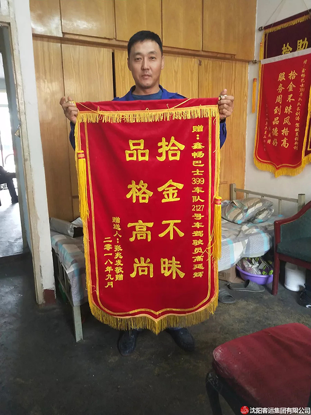 399路0016號(hào)單車駕駛員高延輝,在打掃車廂衛(wèi)生的時(shí)候發(fā)現(xiàn)了老人的包,并第一時(shí)間交給了隊(duì)長(zhǎng)。經(jīng)查看包內(nèi)現(xiàn)金1500余元、一部蘋果手機(jī)及各種證件。經(jīng)過近三個(gè)小時(shí)的努力尋找,最終聯(lián)系到了失主,接到車隊(duì)打來的電話的張老失哽咽的說不出話來。當(dāng)天下午張老就為車隊(duì)送來了錦旗:品格高尚,拾金不昧。